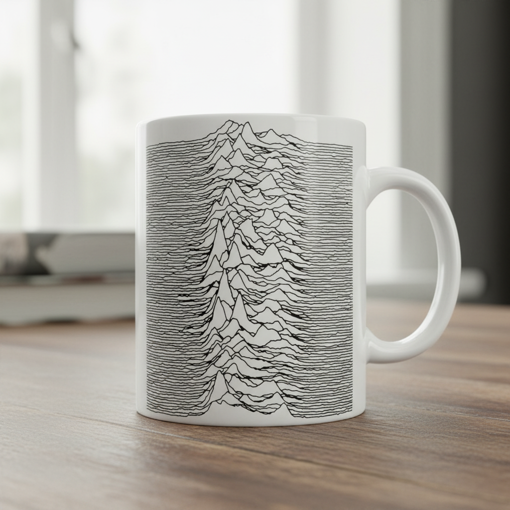 Taza de cerámica blanca del grupo Joy Division con el logotipo